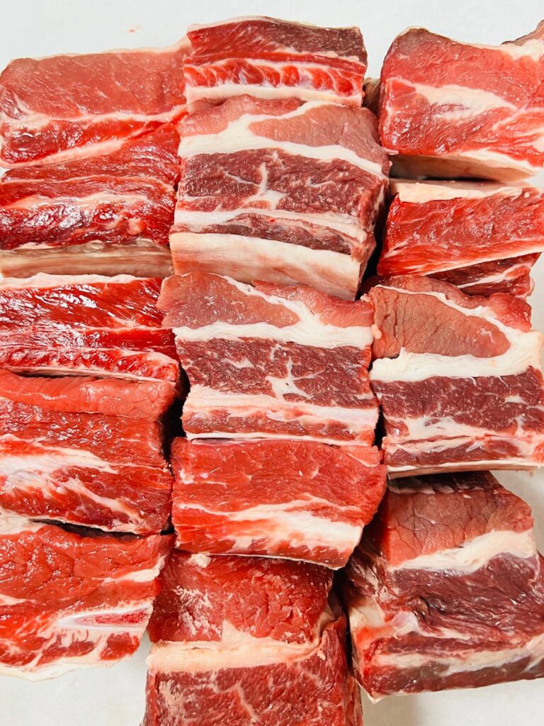 Onze short ribs zijn prachtig gemarmerd en vol rundvleessmaak. Ideaal voor low & slow bereidingen zoals stoven, roken of slow cooking op de barbecue. Het vlees wordt boterzacht en valt van het bot – een echte traktatie voor vleesliefhebbers!